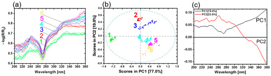 (a) UV reflectance spectra of copper sheets. Copper with initial condition type 1 (green), 2 (red), 3 (blue), 4 (light blue), 5 (pink) and 6 (yellow) represent the oxidation layer thicknesses 0 nm, 4 nm, 8.3 nm, 14 nm and 21.1 nm, respectively. (b) PCA with scores and (c) the corresponding loadings plot.