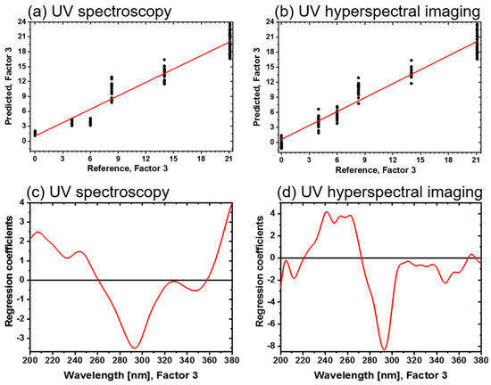 The regression coefficients of the three-factor UV spectroscopy PLS-R model are shown in Figure 7c. Again, absorbance bands around 210 nm, 245 nm, 293 nm and 330 nm emerge, as displayed in the spectra. Above 360 nm, an increasing baseline in the regression coefficient plot is registered. In Figure 7d, the corresponding regression coefficients of the UV hyperspectral imaging PLS-R model are displayed. They have a comparable shape, but more details can be detected. For example, in the range <260 nm and from 310 to 340 nm, more spectral features are pronounced. At 370 nm, a defined band appears for the UV hyperspectral imaging model, while an increase >360 nm in the UV spectroscopy model is registered.