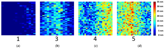 Mean values with a high standard deviation were measured by XPS (see Table 1), as reference values for the PLS-R models. This average of one sample type is comparable to the UV spectra recording. However, hyperspectral imaging enables to recognize different oxide layer thicknesses among the samples. Therefore, the oxide layer thickness in nm of each pixel was calculated. The UV hyperspectral imaging PLS-R model was applied to the four prediction samples of type 1, 3, 4 and 5. In Figure 8, the resulting distribution map is shown. The pixels represent the oxide layer thicknesses in nm, from low (blue) to high (red). Sample type 1 displays the initial direct bonded copper sheet without induced oxidation, while the other samples show an increasing oxide layer thickness.