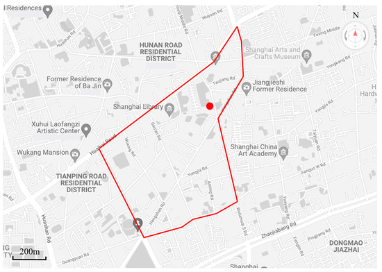In order to verify the validity of the application of the model in this paper to real road networks, a regional road network of about 1.3 square kilometers in Xuhui District, Shanghai, is used as the experimental road network according to the “Technical Standards of Traffic Impact Analysis of Shanghai Construction Projects”. As shown in Figure 1, the area within the red line is the experimental area of this paper. In order to simplify the analysis, the experimental road network only includes the arterial road and secondary arterial roads of the real road network, and the branch roads are not considered due to their low traffic flow; this paper only studies the travel behavior of motor vehicles, and the rest of the travel modes are not considered.