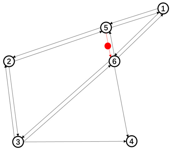 In summary, the experimental road network contains 6 nodes and 14 links, where a node represents the intersection in the actual road network and a link represents the road between two adjacent intersections. In order to simplify the road network, a schematic diagram is established as shown in Figure 2, containing a total of 19 OD pairs, and POI is located between node 5 and node 6. The red line represents the link where the POI is located, and the red dot represents the POI location.