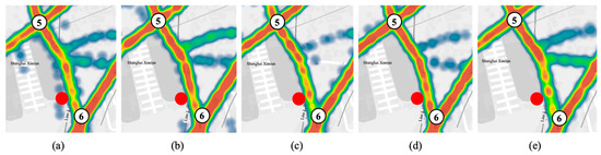 Heat map of peak hour traffic flow on the link where the POI is located: (a) 15:15~15:30; (b) 15:30~15:45; (c) 15:45~16:00; (d) 16:00~16:15; (e) 16:15~16:30.
