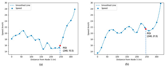 Relationship chart of POI link location and traffic speed: (a) 15:15~15:30; (b) 15:30~15:45.