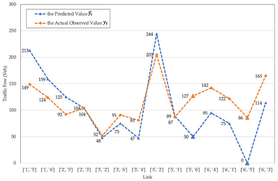 In order to evaluate the effectiveness of the model in this paper, the motor vehicle flow data of the regional road network from 15:30 to 16:30 on Monday, 9 November 2020, was selected as the test group because it is most similar to the subject of this paper in terms of the characteristics of traffic influencing factors, including weather, road network construction, and travel characteristics. The comparison between the predicted and actual values of traffic flow is shown in Table 4, where represents the actual observed value on 9 November and represents the model predicted value on 2 November. Link [‘6’, ‘5’] and link [‘5’, ‘6’] are the links of the two directions of the link where the POI is located, respectively. On this POI link, the model predicted values are all much smaller than the actual values, indicating that during the peak hours, the traffic assigned to the link should be less than the actual traffic in order for the actual road network to better achieve user equilibrium. On some other arterial links, the predicted value of the assigned traffic flow is larger than the actual observed traffic flow, which shares the pressure of the POI link during the peak hours, and the regional road network is closer to the user equilibrium.