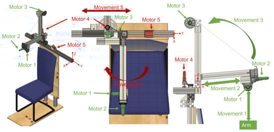 Views of the hybrid exoskeleton developed for arm rehabilitation treatments. Active joints during patient rehabilitation are shown in green; joints for the adjustment of the structure are shown in red. The origin of the system is marked in the three views.