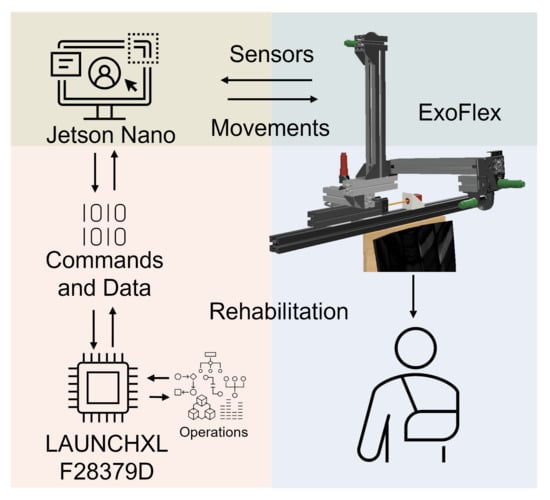 A Jetson Nano communicates with the microcontroller via SPI to transmit movement references and store the data obtained during work sessions for later analysis. A Graphical User Interface (GUI) has been implemented on the Jetson Nano to be able to interact in a simple and friendly way with the exoskeleton and monitor the data in real time. It allows us to select rehabilitation session options. In each session, the type of movement, the elevation angle and speed, the number of repetitions and a waiting time between movements can be configured. The configuration determines the commands to be sent to the motor controllers at any time. The fact that the electronics and software are our own designs allows us to obtain an architecture highly adapted to the needs of the exoskeleton.