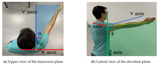 Motion planes. (a) The angle () between the arm and the sagittal plane along the transverse plane determines the elevation plane. (b) The angle is the elevation angle of the arm in the elevation plane.