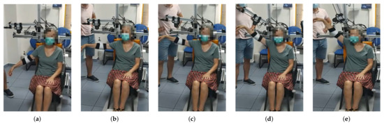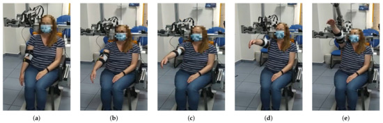 All tests were performed in the patients’ painless range of motion (ROM). ROM was evaluated by a doctor before performing the test. The active range of movement of the patients was determined, as well as the ROM, in which the patient could perform the movement without pain, and thus the exact angles at which the exoskeleton would perform the movements were determined.