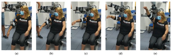 From (a–e) a series of frames corresponding to a flexion movement () are shown. Similarly to the abduction movement, until reaching the 90 degrees arm elevation, the elevation of the arm is uniquely performed by reducing the cable length. In this case, a maximum elevation angle of 130 degrees was programmed, according to the patient’s needs.
