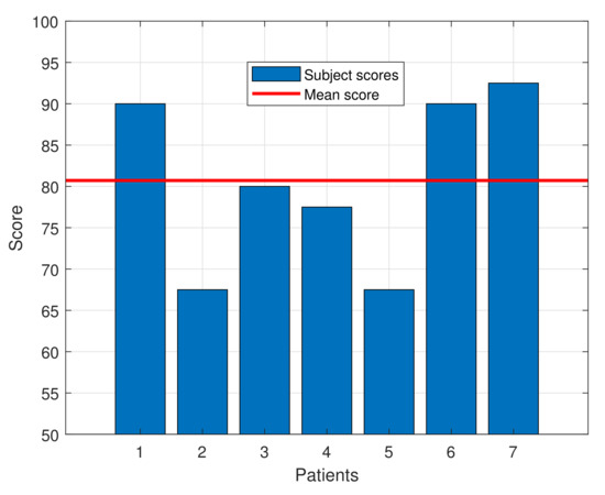 The SUS questionnaire score for the subjects ranged from 67.5 to 92.5, with an average score of 80.71 ± 9.79, indicating a high degree of acceptance by the patients. That score exceeds the average of 68, which, according to the SUS questionnaire standards, defines a tool as usable. Moreover, as defined in [14], a device with this score can be classified as “Excellent” in the acceptability range. Table 3 shows the average score for each question of the SUS questionnaire and Figure 7 presents a bar graph with the individual SUS score for each patient and the average one.