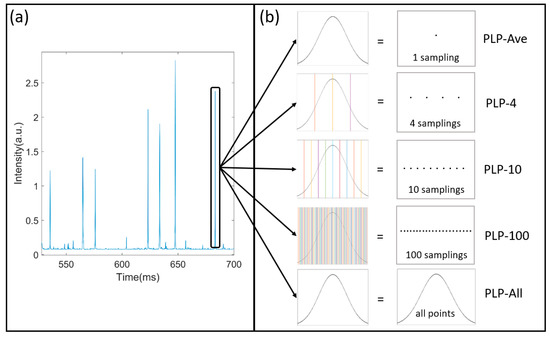 When a single suspended particle passes through the scattering volume, it stays for a while during which it is continuously illuminated and its scattered polarization states are measured. The width of the polarized light pulse is the settling time that the particle stays in the scattering volume. In this case, the particle would be sampled many times by the setup. For example, in Figure 2b, a pulse’s settling time is about 2 ms and if the sampling rate of the DAQ is 200 K sampling per second, then this pulse consists of 400 samplings and the particle is measured 400 times at one measurement. We have 400 scattered polarization states of the particles. Considering that the particle is moving in the scattering volume, we obtain abundant data of this particle and the method of extracting the information from these data is a serious issue. Due to the noises from the electronic system and the environmental light, in previous researches, we first averaged all of the samplings in each polarized light pulse (PLP-Ave) to reduce the influence of the noises on the signals before classifying the suspended particles.