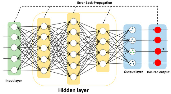 As one of the most traditional neural networks, the main characteristic of backpropagation neural network (BPNN) is that the signal propagates forward and the error propagates backward. Backpropagation is the standard method for training artificial neural networks. This method helps in calculating the gradient of the loss function with respect to all the weights in the network. By fine-tuning the weight of the neural network based on the error rate obtained in the previous period, it can reduce the error rate and improve the generalization and reliability of the model. Therefore, the training and test sets of the BPNN algorithm model that we built use the polarization parameter data, which is measured by the suspended particles in the experimental device. As shown in Figure 3, the input layer of the network training uses , and there are five input nodes. Through multiple experiments, the hidden layer is set to three layers, which are five nodes, six nodes, and four nodes. Finally, there are four nodes in the output layer, corresponding to four types of suspended particles. In addition, we built the algorithm model using the sigmoid nonlinear transfer function, which minimizes the actual output and expected output error function of the system by revising weights and thresholds repeatedly.