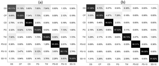 The confusion matrix of eight suspended particles classification: (a) PLP-Ave model; (b) PLP-All model.