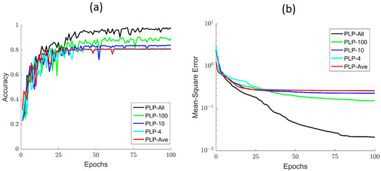 To further show the classification effects of the polarized light pulse processing algorithm, we provide the training details of all the models for different parts. As the number of epoch increases, the accuracy and MSE of these different models are evidently different, as shown in Figure 6a,b. Of note, when the number of epoch is less than 30, all the models increase sharply, but fluctuate strongly and show little differences in accuracy when compared with each other. However, as the number of epoch increases by more than 40, the PLP-Ave model converges to the stable value at first, but then its accuracy becomes worse. On the contrary, the accuracy performance of the PLP-All model is better than the other four models, but converges most slowly. Meanwhile, we can easily see that the models’ accuracy increases with the sampling number of the polarized light pulse. Moreover, these models still have a large difference in MSE. The MSE of PLP-All model reduces the fastest and reaches a lower value of about 0.05. In addition, after the MSE’s stable value reduces with the sampling number, these training details indicate that the PLP-All method has better classification ability, as shown in Figure 6. All of these results emphasize that the PLP-All method can effectively distinguish the CD algae with large differences in the microstructure. In addition, the PLP-All method can still distinguish the microalgal samples (DS, CP, PG) with little differences in appearance and structure. This is related to the effect of polarization information on size, shape, microstructure, and morphology, in order to extract high-quality data from the polarization pulses.
