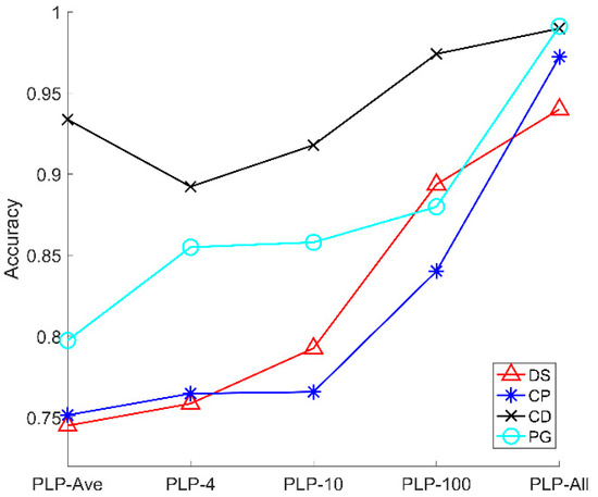 Figure 4c shows the average accuracy of five models. Here, as shown in Figure 6, we provide the accuracy of five models for four microalgal samples. From Figure 7, the accuracy of the three types of microalgae (DS, CP, PG) increases with the sampling number of the polarized light pulse, which is consistent with the average accuracy in Figure 4c. However, the CD is a little different, and its accuracy increases when the sampling number grows from 4 to 100, and finally reaches the maximum in the PLP-All model. In addition, the accuracy of PLP-Ave is larger than PLP-4 and PLP-10, which is quite different from the other models. Therefore, we notice that the accuracy of CD samples is larger than the other microalgal samples. In addition, the accuracy changes in a different manner than the models for the four samples.