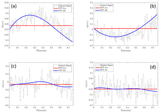 Of note, the PLP-All method suffers the most from the noise of the data, but the classification accuracy is the best. Evidently, the increase of the data amount is one origin for the best performance. In addition, in Figure 4c, it can be seen that increasing the data amount will promote the accuracy. However, we would like to emphasize another origin, which is possibly more essential than the amount of data. Figure 8 shows part of the data, [I, q, u, v], of a polarized light pulse processed by the PLP-Ave and PLP-All methods, respectively and their original signal. The red lines are the average values given by the PLP-Ave method and the blue lines are the temporal values given by the PLP-All method. The temporal values change in the polarized light pulse. Here, we can imagine that if we use the average values given by the PLP-Ave method to replace those of the PLP-All model, the same data amount is ensured, but the classification effect would be no better than the PLP-Ave model. Therefore, the key origin of the best performance of PLP-All method is implied by the time-changing values of polarization parameters of the individual particle, as shown in Figure 8.