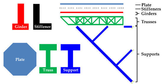 The purpose of this study is to apply a two-step damage detection technique to an offshore helideck. The helideck model developed in [7] is used in this study. It consists of a plate, stiffeners, girders, trusses, and supports, and the cross sections are illustrated in Figure 1. The total number of the trusses is 156 and they are divided into three groups, TRSV, TRSH, and TRHD, while a total of 16 support members are categorized into five groups, SPT1, SPT2, SPT3, SPT4, and SPT5. The members of a group share a section, and the section dimension of each member groups are listed in [7]. The total number of elements of the FE model is more than 80,000. The material is a high-tensile steel HT-36 with a material density of 7850 kg/m3 and an elastic modulus of 200 GPa.