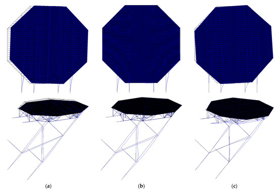 Mode shapes of the intact offshore helideck: (a) first mode; (b) second mode; (c) third mode.