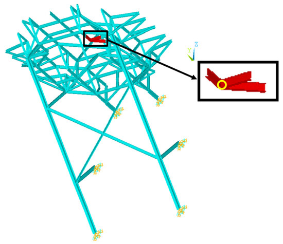 This study focuses on the truss and support components for damage detection owing to their roles. Because the trusses bear the weight of the upper deck and the supports connect the helideck to its mother vessel while supporting the whole weight, any critical damage would impact the safety of the helideck as well as its mother vessel. One of the common types of damage to the lattice structure is fatigue, which occurs on joints connected to several members due to various environmental causes, such as corrosion, vortex-induced vibration by wind, and earthquakes, as well as production causes, such as micro-cracks during welding or assembling [18]. Focusing on an offshore structure, the salinity arising from seawater leads steel members to be corroded, and this happens in a wide range over the structure because of droplets of seawater in the air. Additionally, the vibrational response due to waves and winds causes fatigue at the joints. These phenomena not only always occur but also interactively worsen the condition of the structure, i.e., accelerate the degree of damage. Hence, this study deals with that type of damage. With the assumption that such damage weakens the structural capacity of all the members connected to the joint, the truss and support members are grouped into a total of 70 parts based on the intersection joints, and the members in a group are assumed to share the same damage. In Part 18, for instance, there are three red members intersecting at a joint with a circle mark, as shown in Figure 3, and therefore, they would share any damage. The damage was simplified as the decrease in the elastic modulus in this study, because the mechanism of actual physics of the corrosion and fatigue is the matter at the molecular-atomic level, and therefore, it is very difficult to accurately and precisely implement it in a finite element model for a large structure. If the damage severity of this part is assumed to be 10%, the value of the elastic modulus of all five members decreases by 10%.