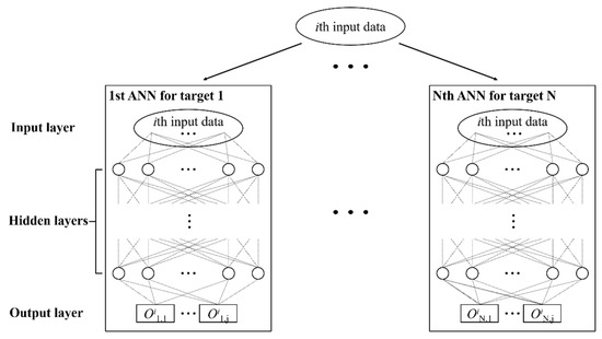 Figure 4 shows a flowchart of the damage detection. The first step is to complete the normalized mode shape of the unknown points. The next step is to evaluate the damage severity of each damaged part. Among 70 neural networks of ANN group 2 in the second step, for example, the neural network corresponding to the group of the red members (Part 21) in Figure 3 predicts the single damage severity of all the elements comprising the red members. Both steps have multiple unknowns to be solved; therefore, ANN groups are constructed in this work to ensure higher accuracy. For example, if there are N targets and a target consists of j elements (i.e., the number of unknown variables is N times j), N single ANNs corresponding to each target are trained to output the predicted values of the target, as shown in Figure 5.