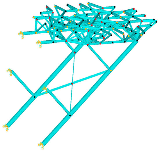 A total of 87 measurement points of the truss and support members, including the 70 intersection joints, are used to express the mode shapes of the helideck. In this study, four damage detection cases were trained independently, as shown in Table 1. Case 1 is to identify the damage from the entire normalized mode shapes composed of all 87 points, and therefore, directly goes through step 2 without step 1. On the other hand, it was presumed that only 44 and 22 points were measured for cases 2 and 3, respectively. The sensor places are shown in Figure 6. The yellow points are 22 points of case 3 and the red points added to them are 44 points of case 2. The total of the yellow, red, and black points are 87 points of case 1. The mode shapes at those points are assigned to ANN group 1, and then the mode shapes at the remaining points are estimated through step 1. After finishing the ANN training, the entire mode shapes were collected by assembling the predicted values with the measured values, and the ANN group 2 was trained in the completed mode shapes to predict the damage severities. By comparing cases 1 to 3, the tendency of the results of the proposed damage detection from more limited measurements is observed. Case 4 is the same as case 3, except that it does not go through step 1 to detect damage, and the results of cases 3 and 4 are discussed to comprehend the effectiveness of step 1 when the mode shapes are limited.