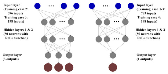 Yang et al. [26] proposed two transfer strategies for deep learning. The first is to inherit the network architecture together with the weights and biases of the source network model, and hence, it is appropriate for the new dataset to be very similar to the original data; the second is to take only the architecture. In this study, the latter was applied because of the difference between the datasets used in this research and in the source network model developed by [13]. The network consists of two fully connected hidden layers with 50 neurons, without biases. The ReLU activation function was used for each layer. Figure 7 illustrates the topology of a network in ANN groups 1 and 2.
