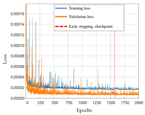 Among 137,000 sets in the random damage scenarios, the numbers of training and validation data were 109,600 and 27,400, respectively. As an example, the loss history of the network for damaged part 29 of training case 1 is shown in Figure 8. The blue and orange lines show the losses for the training and validation data, respectively. The training was terminated when the maximum number of epochs was 2000. The vertical red dotted line represents the epoch where the loss function for the validation data is the smallest, and the weight values of the trained network are selected at this epoch to prevent the overfitting problem.