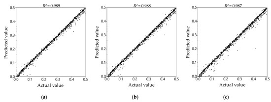 The coefficient of determination () is utilized to estimate the prediction performance of the trained networks. It is the ratio of the sum of squared regression () to the sum of squares total (), as shown in Equations (5)–(7). That is, the coefficient indicates how well the predicted values represent the total variation of the real values; therefore, the closer to 1 the value is, the better the outputs agree with the statistical distribution of the targets.