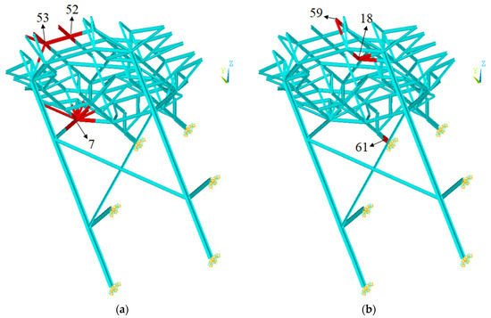 The prediction results for two damage scenarios among 400 test data were compared to show the prediction accuracy of the three training cases in detail. The damage scenarios are shown in Figure 10. Parts 7, 52, and 53 were damaged in test scenario A, while parts 18, 59, and 61 were damaged in test scenario B, in which the prediction error was relatively large among all 400 test cases.