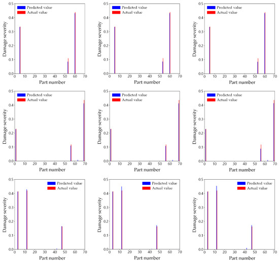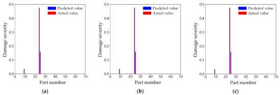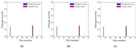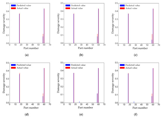 Table 7 enumerates the R2 values of the three training cases for the test dataset, depending on the individual network by the damaged part. Damaged parts 54 and 61 are the locations where R2 is the least in all the training cases; nevertheless, their R2 values are greater than 0.9. In most damaged parts, R2 of training cases 2 and 3 were almost the same as those of training case 1. This shows that even though only half or a quarter of mode shape data is used, the proposed two-step damage detection technique can provide fairly reliable performance in most parts. In only a few parts, R2 is slightly lower because of the limited data. For instance, Part 43 is where the difference in R2 among the training cases is the largest. R2 in training cases 2 and 3 were approximately 0.054 and 0.082, respectively, less than 0.994 in training case 1. That is, the fewer the mode shape data, the less the R2 is. In spite of this, the R2 values in training cases 2 and 3 were 0.940 and 0.912, respectively. Consequently, the proposed method was able to accurately detect damage severities with a similar level of precision as the results from the complete mode shapes in most of the damaged parts. In a few parts, although the capability to predict the damage was slightly worse because of the limited sensors, the performance was not significantly worse.