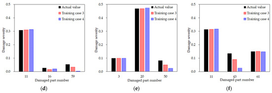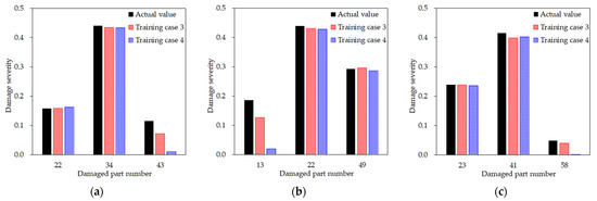 To verify the effectiveness of the two-step procedure, the prediction results of training cases 3 and 4 for certain test scenarios were compared. As shown in Figure 14, test scenarios were selected in which both training cases correctly located the damage, but the damage severity was not estimated accurately. The first observed finding is that one among the three damages is underestimated. Second, understated damage is not the most severe damage in the three damages, which is less than 0.2. The reason might be that such minor damage is less likely to affect the modal properties compared to other major damages, and therefore, they would be rather difficult to detect. Nevertheless, it is important that training case 3 more correctly identifies the damage severity of the minor damage than training case 4. For example, while training case 4 predicted the severity to be much smaller than the actual damage, training case 3 estimated a much closer value—specifically, over half of the true value. This tendency appears not only in these scenarios. Therefore, it can be concluded that, although it may be unavoidable that very few measurements lead to the underestimation of minor damage under the multiple damage conditions, the proposed two-step technique is advantageous because it can identify relatively less critical but more elusive damage than detecting damage directly with only available sensor data.