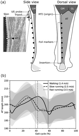 - Fukunaga, T.; Kubo, K.; Kawakami, Y.; Fukashiro, S.; Kanehisa, H.; Maganaris, C.N. In vivo behaviour of human muscle tendon during walking. Proc. R. Soc. Lond. Ser. B Biol. Sci. 2001, 268, 229–233. [Google Scholar] [CrossRef] [Green Version]