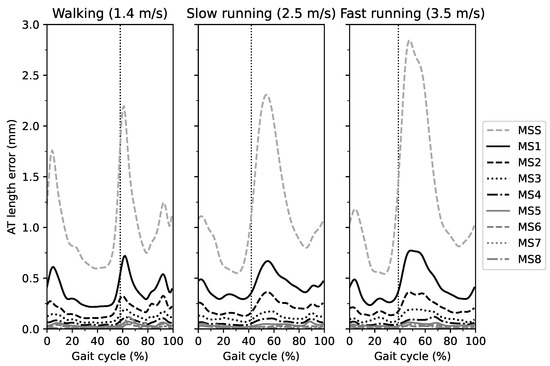 The AT length measurement error was significantly greater during the swing phase than the stance phase, indicated by the significant main effect, but the magnitude was rather small. Furthermore, this difference diminished at marker-sets with a greater foil marker number (<MS4). It is reasonable to assume that the greater error with fewer markers during swing arises from the high plantar flexion angles after toe-off, which affects the AT curvature. The gait speed showed no significant effect on the AT length measurement error, indicating a comparable curvature behavior between speeds and gait modes, suggesting that the same marker-set can be used for different gait speeds and modes.