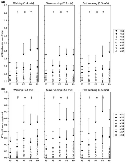 Averaged Achilles tendon (AT) length measurement error for each marker-set with respect to the curved reference length of the AT during the (a) stance phase and (b) swing phase of walking, slow and fast running. The marker-set with i number of foil markers (MSi) is the AT length with i = 1 to 8 foil markers. P5 to P9 are the clustered participants with the same number of foil markers. The error bars express the standard deviation of the AT length error throughout the phase (stance, swing), showing the variance over each phase and then averaged among individuals within each cluster. * main effect of phase (), † main effect of marker-set (), # interaction effect of phase and marker-set (). The post hoc analysis for the comparison of marker-set between swing and stance phases revealed significant lower errors for MS1-3 ( and , respectively) during the stance phase and no significant phase differences for MS4-8 ().