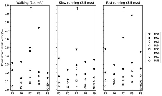 Maximum strain error of the Achilles tendon (AT) during walking, slow and fast running for marker-set 1-8 (markers-set (MS) with 1 to 8 foil markers) with respect to the marker-set with all possible foil reflective markers. Participants were clustered into five groups of P5-9 (participants with 5 foil makers to participants with 9 foil markers). † main effect of marker-set ().