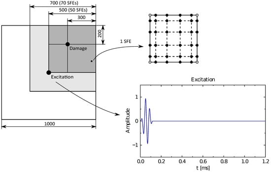 The analysed panel has been modelled by six-node shell SFEs derived using TD-SFEM, described in more detail here [44]. The node distribution for the examined SFE has been based on Lobatto polynomials [47] and is presented in Figure 1b. In order to analyse the panel, 50 × 50 SFEs have been employed with the final grid size of 250 × 250 nodes. Additionally, an absorbing layer consisting of 2400 SEFs [48] has been assumed to conduit propagating waves out of the system. The panel has been excited with a sine wave signal (three modulations) modulated by a Hanning window [49] with a carrier frequency of 25 kHz. The total measurement time has been assumed as 1.2 ms, whereas the results have been recorded at the same moment in each case, that is at 0.8 ms. An illustration of the geometrical dimensions of the analysed panel is shown in Figure 1. This figure also shows the waveform of the excitation signal, as well as the distribution of nodes in one SFE. Additionally, it is worth mentioning that the position of SFE corner nodes remains the same as the position of the measurement points in LDSV.