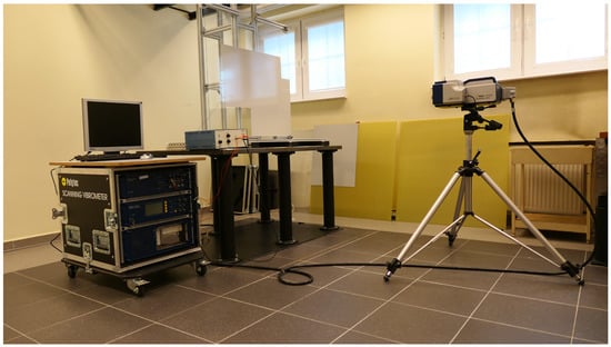 The experimental part of measurements has been carried out with LDSV Polytec PSV-400 [50] (a picture of the measuring system is shown in Figure 2). The most important part of this measuring system is the scanning head with a laser Doppler vibrometer, which allows fast, accurate, and non-contact measurements of vibrations of the whole surface under investigation. The main advantages of such a sensor are: measurement automation, high sensitivity and the non-contact nature of measurements. This approach allows entire surfaces to be scanned quickly and accurately by using flexible and interactively created grids of measurement points. LDSV automatically moves to each point on the scanning grid points, measures responses, and validates the measurements by checking the signal-to-noise ratio. In order to ensure the optimal measurement conditions, high scattering of the laser beam reflected from the measurement surface should be avoided because even a small amount of light returning to the sensor head can cause measurement interference. To compensate for this effect, the measured area should be covered with a reflective foil. The characteristic feature of such a foil is that it reflects light in the direction of its source. The full wave-field measurements of out-of-plane velocities were carried out on the surface opposite to a piezoelectric transducer. All measurements were performed in equally spaced grids with varying numbers of points, covering the whole surface of the specimen. Ten times averaging for each recorded time response was used to obtain higher signal-to-noise ratio.