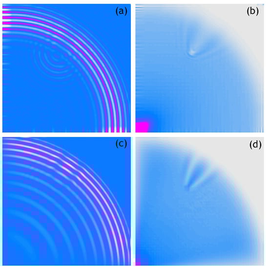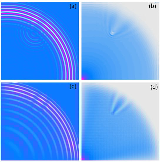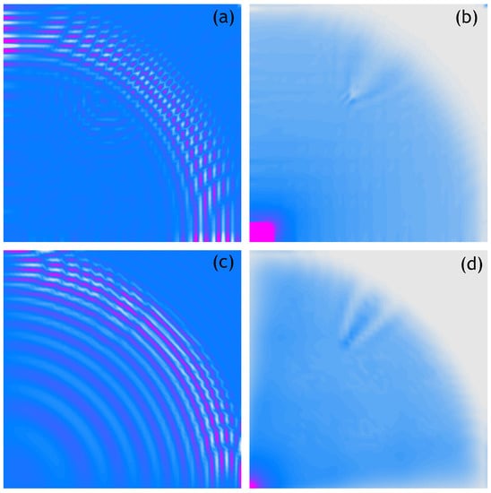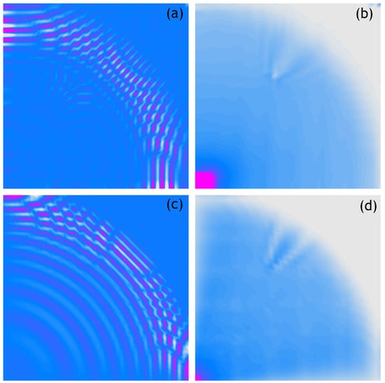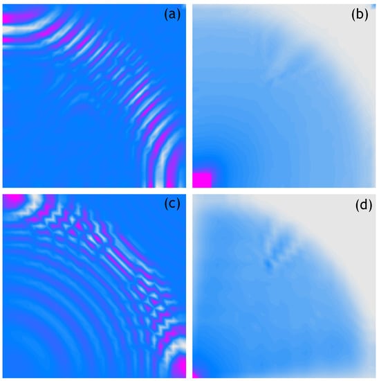 Wave propagation velocity patterns registered at 0.8 ms with 250 × 250 mesh grid, (a) Experimental data, (b) RMS of experimental data, (c) Calculated data, (d) RMS of calculated data.