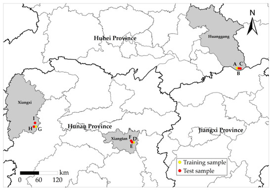 Study area and sample distribution. Area A–C images were obtained by GF-2, and their longitudes and latitudes range from 115°56′20″ E, 29°49′02″ N to 116°00′32″ E, 29°45′22″ N. Area D–F images were obtained by Worldview-2, and their longitudes and latitudes range from 112°46′09″ E, 27°39′55″ N to 112°48′34″ E, 27°38′06″ N. Area G–I images were obtained by UAV, and their longitudes and latitudes range from 110°05′30″ E, 28°07′36″ N to 110°06′36″ E, 28°06′52″ N. Area A, D and G samples were used for model training. Area B, E, H samples were used for model testing. Samples from areas C, F, and I were used for model generalization verification.