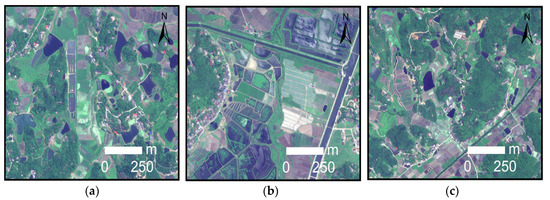 Different types of water bodies obtained by Worldview-2. (a) Irrigation lakes; (b) duckweed lakes; and (c) trenches.