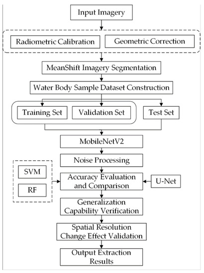 In this work, a lightweight deep neural network, MobileNetV2, was applied to extract water bodies from complex scenes in high-resolution remote sensing images obtained by 3 different sensors. All experimental flows in this study are shown in Figure 5. Firstly, the images were corrected and clipped, including radiometric correction, geometric correction and clipping of the study area, to generate high-resolution RGB image data with obvious features and accurate positions. Then the cropped images were segmented by Mean Shift, which combines the adjacent pixels with similar spectral, texture and shape features together, which is more conducive to the interpretation of different ground objects by human eyes. After image data preprocessing, the water and non-water samples in the high-resolution image were manually vector labeled in ArcGIS10.6 to construct the water extraction sample set of the high-resolution remote sensing image, in which the images and vector labeled results of areas A, D and G were used as the training and verification sample data set. The image and vector annotation results of areas B, E and H were used as the test sample data set, and the image and vector annotation results of area C, F and I were used as the generalization test sample data set. The proportion of the 3 sample data sets was 6:2:2, respectively. Next, we introduced the MobileNetV2 model into pixel classification, and input the training sample data sets of 3 different sensors into the deep learning model for individual training. The corresponding input of the trained model was put into the test images of 3 different sensors for inference, and the classification graph of pixel marking results was output. There were some noises in the result image of pixel classification, and morphological methods were used in this study to remove the noises. Finally, we verified the accuracy of the post-processed classification graph and reference annotation result graph and compare and evaluate the accuracy of MobileNetV2 model with support vector machine and random forest model based on machine learning, and U-Net model based on deep learning. In order to verify the generalization ability of MobileNetV2 model, we further classified and evaluated the accuracy of MobileNetV2 model in more complex generalization test images. In addition, we analyzed the impact of the combination of different sensors and training datasets with different spatial resolutions on the accuracy of the MobileNetV2 model for extracting water bodies.