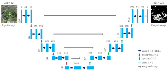 The U-Net network structure is based on the expansion and modification of the fully convolutional neural network (FCN). Its network structure is U-shaped, which is composed of the contraction path used to obtain the context information in the left half and the expansion path symmetrically used to accurately locate the target in the right half, as shown in Figure 6. In the left half of the path, the input image size was 224 subpaths, and the number of dimensions was 4. After passing through f4 convolution layers and pooling layers, a high-dimensional feature map with a size of 14 layers and a number of dimensions of 1024 was obtained. Then, the expansion path of the right half was upsampled layer by layer and fused with the feature map of the corresponding level in the left contraction path. At the last layer of the network, the 1-dimensional convolution layer was used to map the 64-dimensional feature vector to the output image of the 224-feature vector map. Then, the sigmoid function was used for classification, and finally, the water body extraction results were consistent with the spatial resolution of the input image [54].