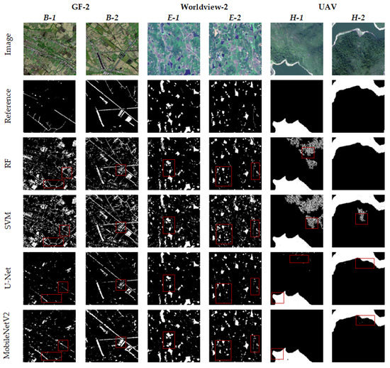 The machine learning models of SVM and RF and the deep learning models of U-Net and MobileNetV2 were applied to extract the water bodies. The overall comparison of the water body extraction results of different high-resolution test images is shown in Figure 8 (in the reference and results figures, white indicates water bodies and black indicates non-water bodies). Among them, GF-2 B-1, GF-2 B-2, Worldview-2 E-1, and Worldview-2 E-2 are plain areas, mainly with township buildings, irrigation paddy fields, ditches, broken lakes and slender rivers, and a considerable part of small-area water bodies are distributed around the water system. UAV H-1 and UAV H-2 are mountainous areas and mainly composed of large-scale rivers, vegetation and mountains. In the image, vegetation and mountain areas have obvious shadow areas.