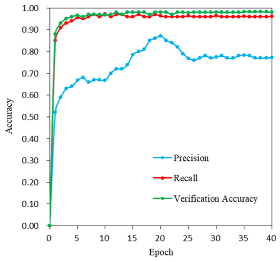 This paper analyzes the sensitivity of the data training and verification accuracy of the MobileNetV2 network under different epochs, as shown in Figure 10. The results show that when the number of epochs was five, the model Precision rate was 66.7%, the verification accuracy was 96.6%, and the Recall rate was 95.6%. As the epoch number increased, the model verification accuracy increased. When the number of epochs reached 20, the Precision rate of the model was the highest at 87.2%. However, the accuracy decreased as the epoch number increased, indicating that more or fewer epochs are not conducive to the task of semantic image segmentation. With a low number of epochs, the model training will lose a large number of image features, and with an excessive number of epochs, overfitting of the model may occur. The accuracy of the model was higher only when the number of epochs was moderate, which is beneficial to obtaining fine and accurate extraction results.