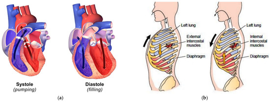 Asymmetrical movements of human organs: (a) pumping and filling of blood in the heart; (b) expansion and contraction in the lungs [25,26].