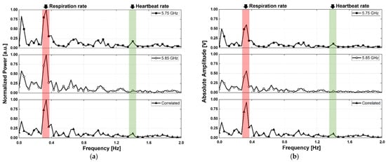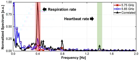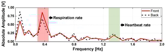 Frequency spectrum of the vital signals simultaneously measured from the two radars placed in front of and behind the subject.