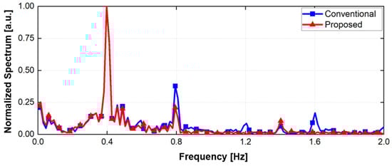 Simulated spectrum of the conventional and proposed signal processing methods.