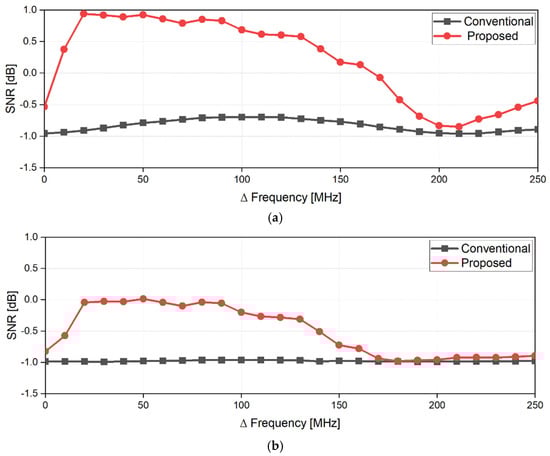 Signal-to-noise ratios of the conventional and proposed signal processing methods depending on the difference in the operating frequency of the two radars: the signal is the magnitude of the vital signs and the noise is the magnitude of the signal caused by the human body movement: (a) for respiration; (b) for heartbeat.