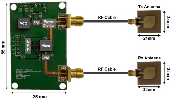 A configuration using multiple radars, as shown in Figure 4, is proposed to increase the SNR of vital signal detection while considering the asymmetrical movements of human organs. The radar modules in the 5.8 GHz frequency band, which operate independently and consist of transmitting and receiving front-end and baseband circuits, are separately located at the same angle (θ) to the left and right and at the same distance (d0) from the subject. The operating frequencies of the two radars are set to be different within the frequency band to reduce the degradation from a direct signal coupling between them and are arranged at an angle of 30° or more for a sufficient separation distance to reduce the increase in noise due to the blocker signal. When the operating frequencies of the two radars are different in the frequency band, the transmitted signals T1(t) and T2(t) from the two radars can be expressed as follows: