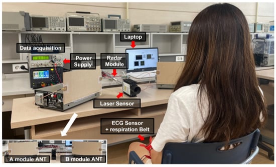 Two signal channel radar modules were implemented for the proposed radar configuration as shown in Figure 9 [17]. The operating frequencies of the two radars in the 5.8 GHz ISM band are individually determined with the control voltage of a voltage-controlled oscillator (VCO). In the experiment, the frequencies were set to 5.75 GHz and 5.85 GHz, with a frequency gap of 100 MHz. The transmitted powers at each radar module were measured to be 7.8 dBm at 5.75 GHz and 9.3 dBm at 5.85 GHz, respectively. The desired LOS, as shown in Figure 10, was set to the position and angle of the patch antenna with an antenna gain of 4.4 dBi, which is connected to the radar module through low-loss RF cables. The quadrature signals of the module were simultaneously obtained using a data acquisition board (NI USB-6366, National Instruments, Austin, TX, USA) with a sampling rate of 1 k samples per second in each channel of the two radars. A three-electrode ECG sensor (EKG-BTA, Vernier Software & Technology, Beaverton, OR, USA) and respiration belt (GDX-RB, Vernier Software & Technology, Beaverton, OR, USA) were used as reference sensors to compare the accuracy of vital sign detection using the proposed radar configuration. The reference data for displacement and velocity of the human body movement were measured using a laser sensor (ILR1182-30, Micro-Epsilon, Ortenburg, Germany) with a resolution of 0.1 mm and sampling rate of 50 samples per second.